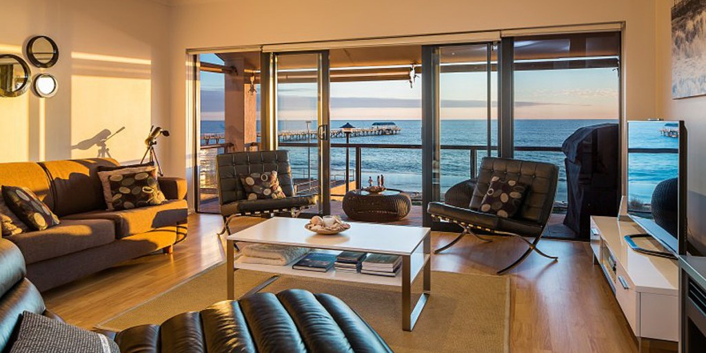 Stunning ocean and jetty views are a key selling point of this modern two-level townhouse next to Henley Square. There’s an open-plan kitchen, dining and living area with stainless-steel fireplace and sliding doors to the seafront balcony, and two carpeted bedrooms, with the ocean-front main incorporating a full en suite. Other features include wrap-around courtyard and entertaining areas, plus an outdoor shower.