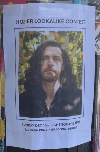 Now, our time has come. Are you a tall man, non-binary person, or masculine lesbian with long brown hair? Well, if you have no plans on December 15, come down to Light Square, where you could become the proud owner of $25 and bragging rights at the Hozier look-alike contest.