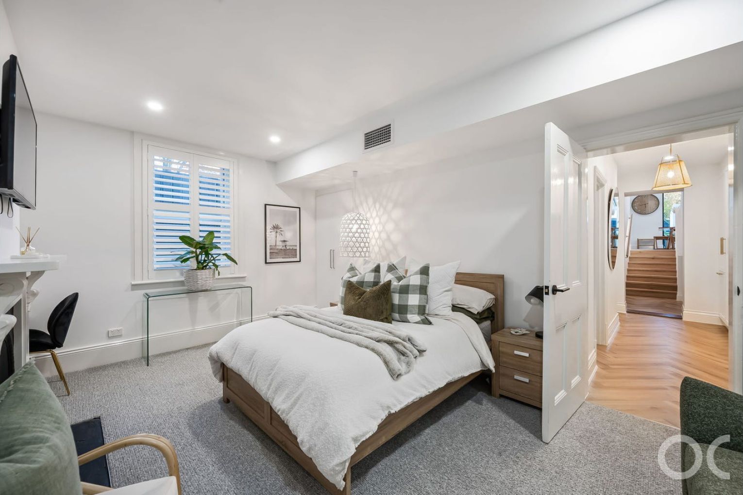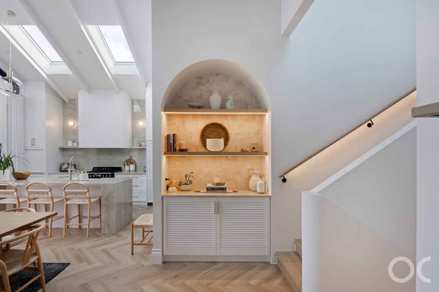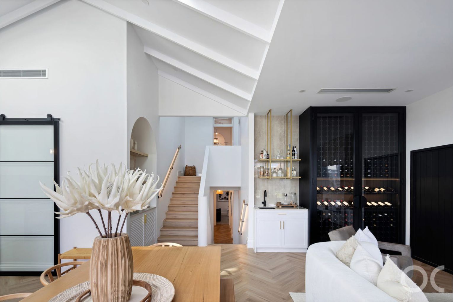 Mix a drink at the bespoke gin bar with Zip hydrotap filtered with still or sparkling, select a bottle from the stone-clad wine cellar tucked below the street-facing home office, or simply unwind by the ambient fireplace set into a sandstone wall in the main living space.