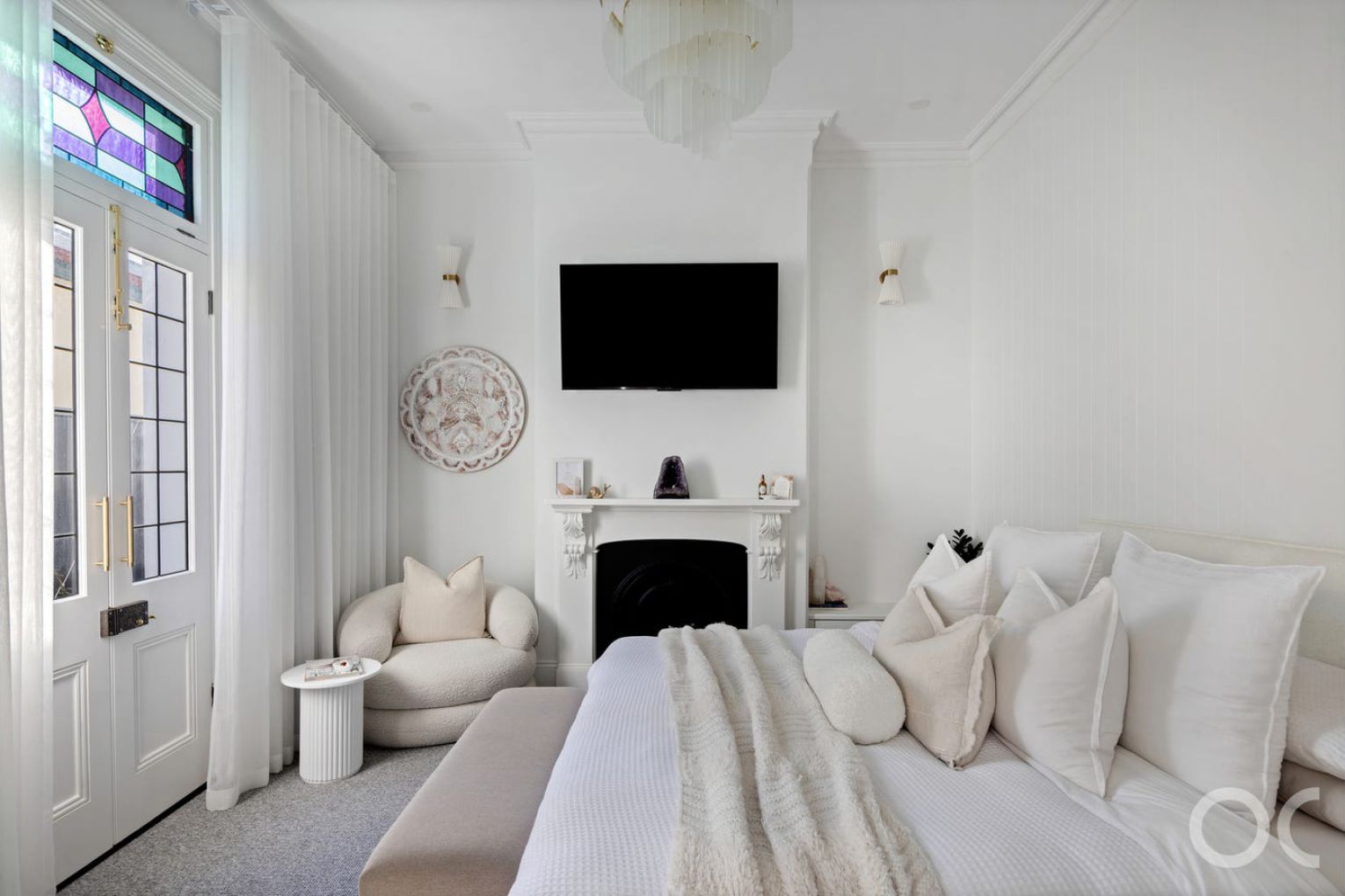From the moment you step inside, heritage charm unfolds with soaring ceilings, ornate arches, ceiling roses, wainscoting, and elegant plantation shutters, all softened by a contemporary coastal palette of whites, earthy timbers, and linen sheers.