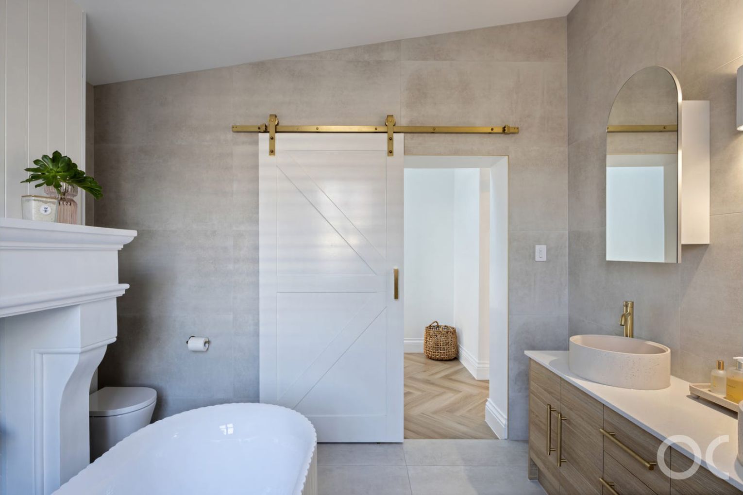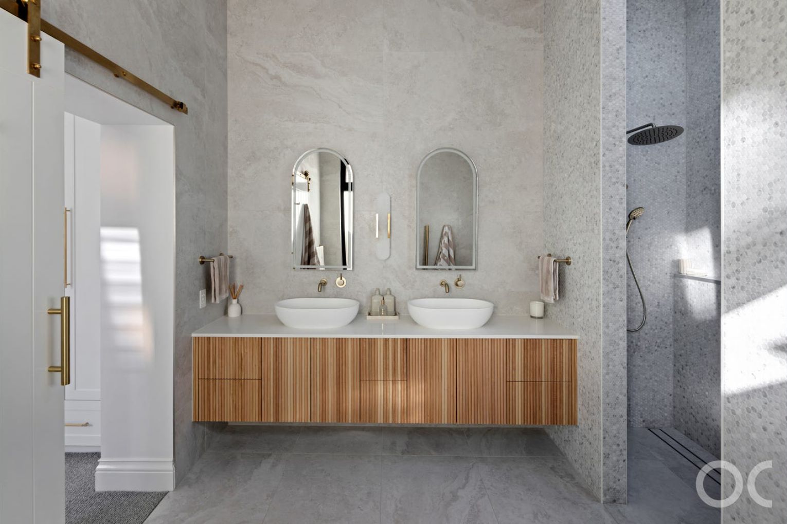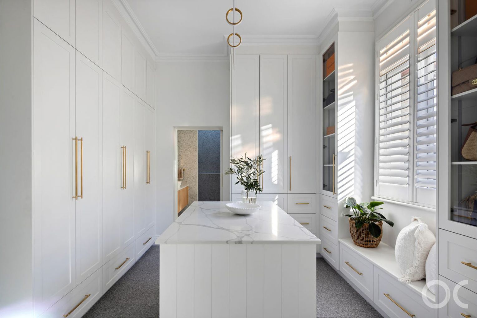 Inside, the opulent main suite is a sanctuary, featuring a bespoke ensuite with heated floors, curved shower, marble penny-round tiling, circular freestanding bath, and dual quartz-topped vanities. The custom walk-in dressing room, adorned with Lo & Co hardware and glass display cabinetry, is every designer lover’s dream.