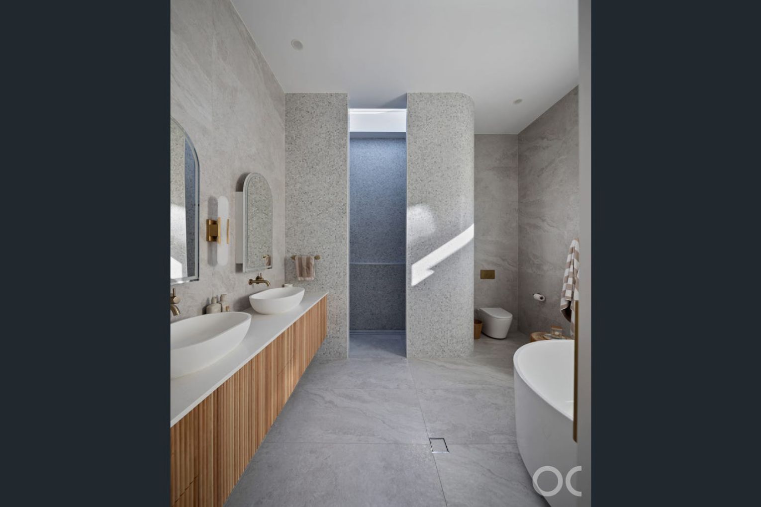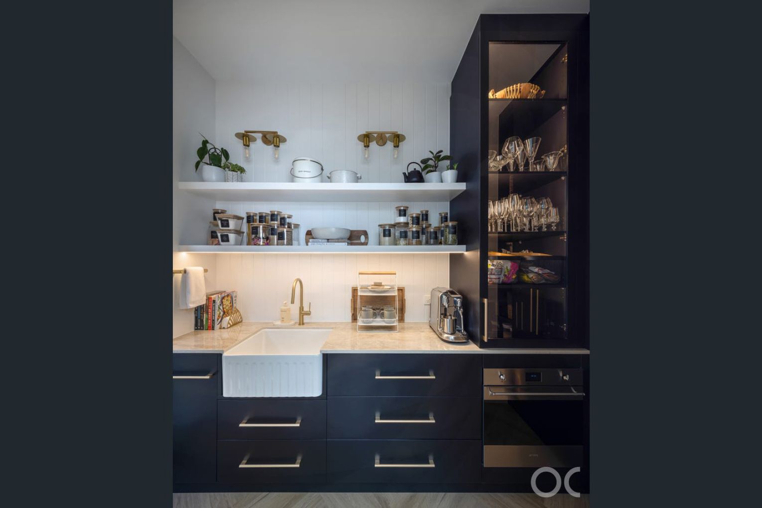 At the heart of the home, a statement kitchen impresses with Dekton benchtops, a Smeg 90cm vintage-style cooker, integrated appliances, farmhouse sinks, a butler’s pantry, and flowing curves that echo the home’s refined aesthetic.