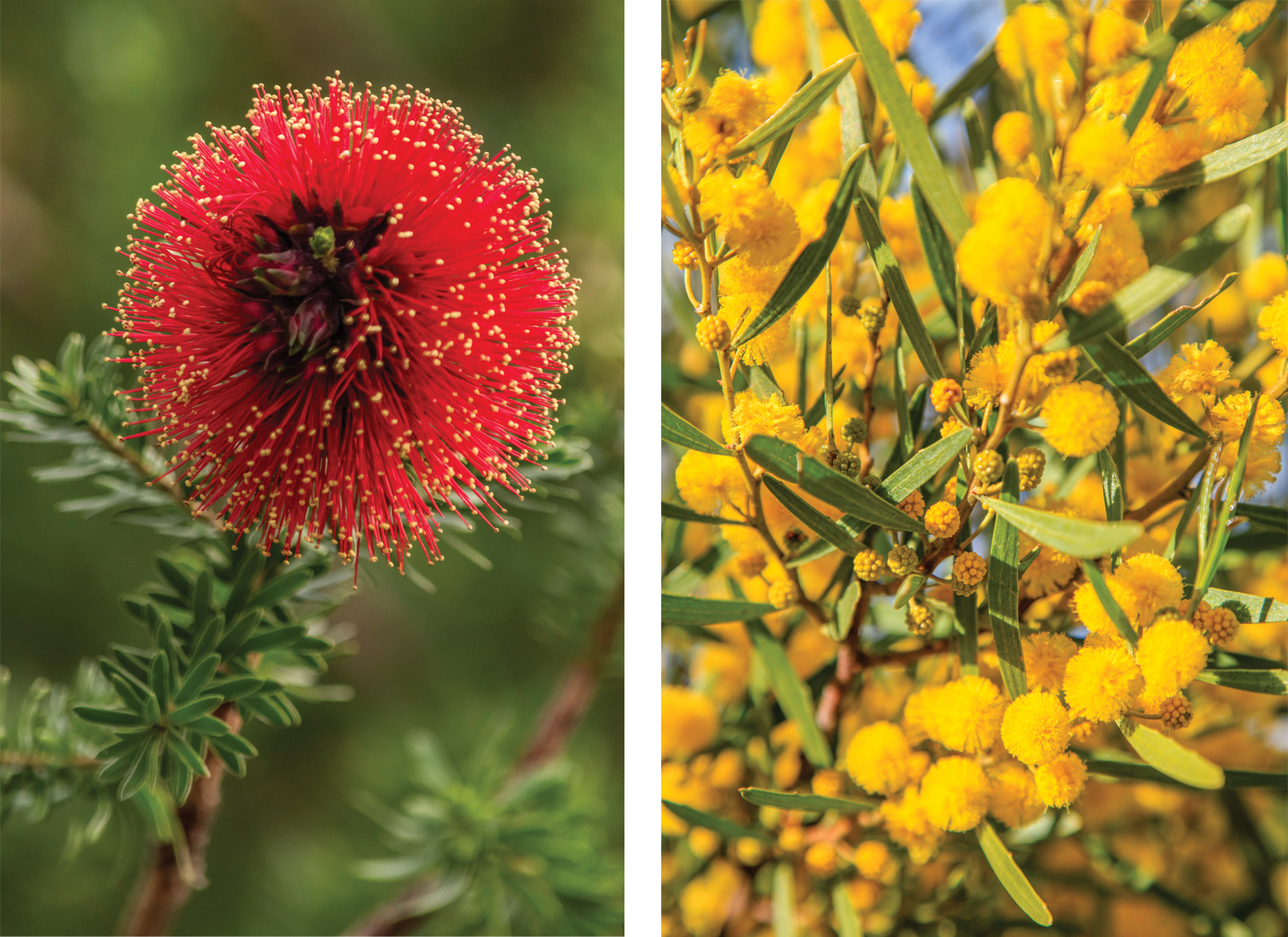 The garden now boasts thousands of native trees and plants, ranging from black sheoaks (Allocasuarina verticillata) to pink gum (Eucalyptus faciculosa), dryland black paperback (Melaleuca lanceolata), mallee honeymyrtle (Melaleuca-acuminata), muntries (Kunzea pomifera), Eremophilas, silver cushion bush (Leucophyta brownii), dwarf Hakea (Hakea rugosa), Hakea ‘Burrendong Beauty’, red pokers (Hakea bucculenta) and desert flame (Chrysocephalum apiculatum).