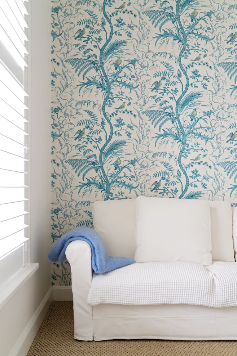 The white and neutral palette of Heidi’s office/snug is broken up with the striking “Bird and Thistle” wallpaper, also by Brunschwig & Fils.