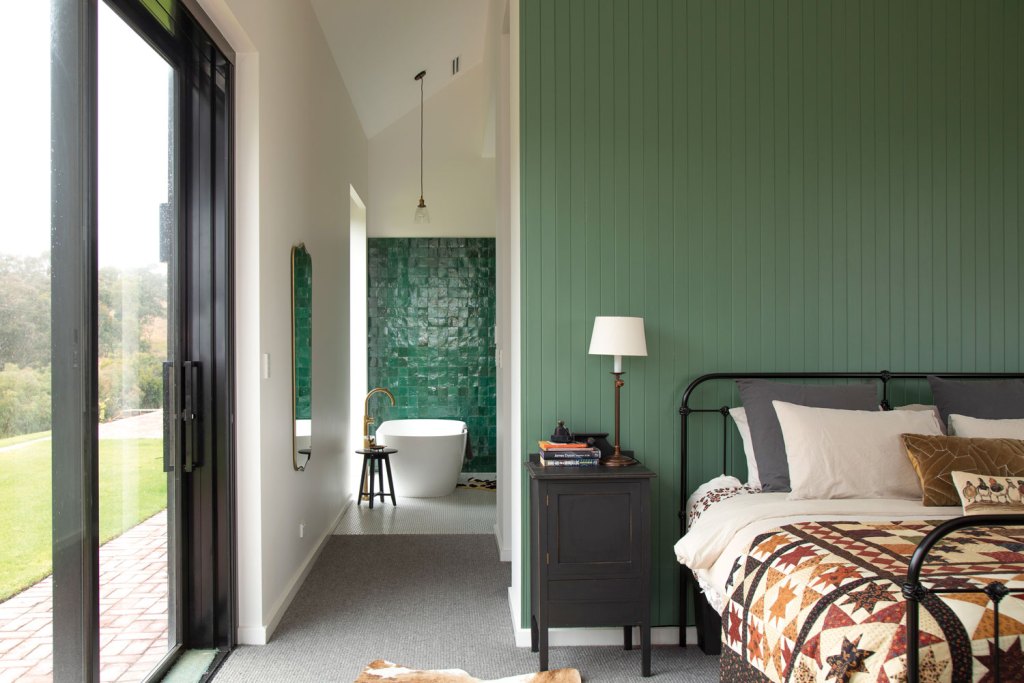 The colour green is a theme in spots, including the gloss Moroccan Zellige tiles in the ensuite, the green painted timber panelling behind the bed in the master bedroom, and a collection of green bottles in all shapes and sizes, which sits on a large antique table in the entry hall. Under that table sits a row of muddy boots and shoes, adding to the authentic farmhouse feel.