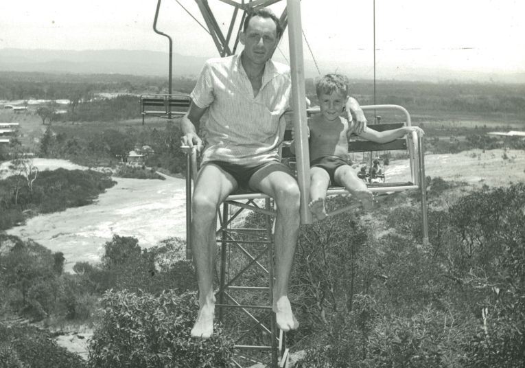 Young Brett with his father Joe, who he says was a “soft touch”, on a Gold Coast chair lift circa 1963, close to their beach house.