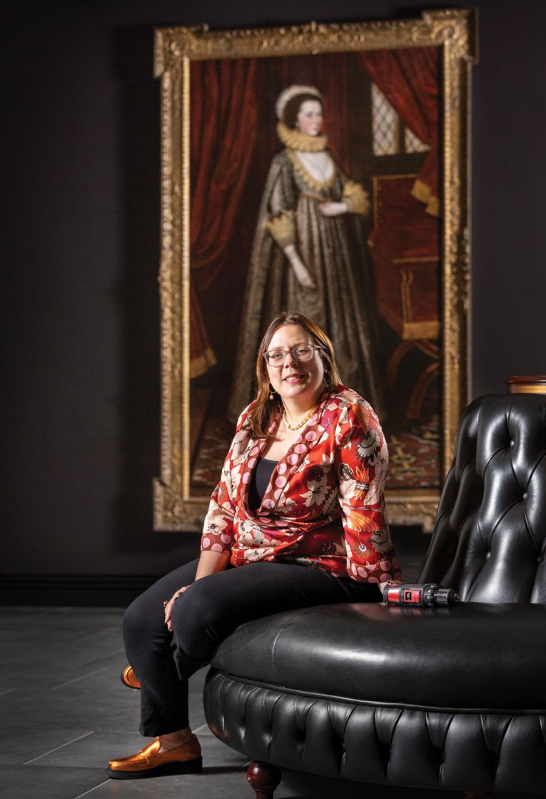 Curator Tansy Curtin in front of Marcus Gheeraerts’s, Magdalen Poultney, later Lady Aston c.1620.