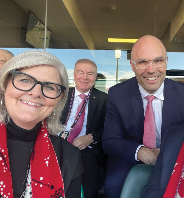 Andrew at a Swans match with the club’s CEO and former St Peter’s College student Tom Harley, and Australia’s Governor-General Sam Mostyn, front.